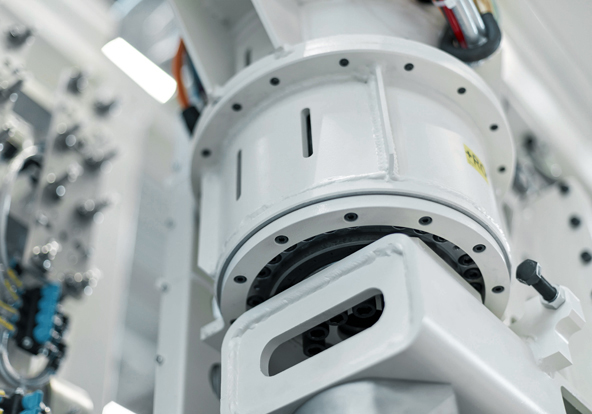 Het garanderen van een uitstekende en constante positioneringsnauwkeurigheid was doorslaggevend voor de zwenkarm voor spuitgietmachines. De Galaxie® D voldoet aan deze prestatie-eigenschap met zijn hoge torsiestijfheid en gereduceerde hoekverdraaiingsspeling tot minder dan één boogminuut. De enkelscharige kinematica houdt in dat bijna alle afzonderlijke tanden tegelijkertijd betrokken zijn bij de tandwieloverbrenging - en dus bij de koppeloverdracht en de stijfheidsvorming. Bovendien zijn de tandflanken van de afzonderlijke tanden en het tandwiel met inwendige vertanding ontworpen als een logaritmische spiraal. Hierdoor ontstaat een oppervlaktecontact in een multi-tandwieloverbrenging - met een beduidend hogere contactverhouding.